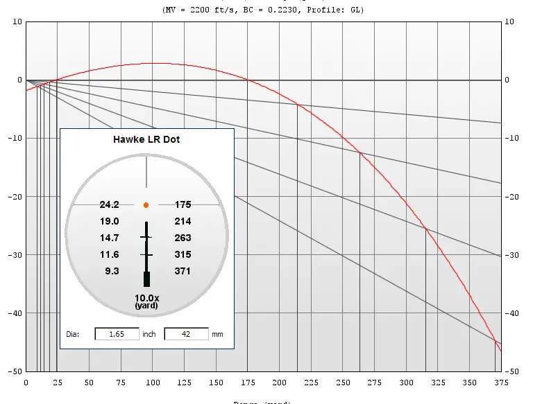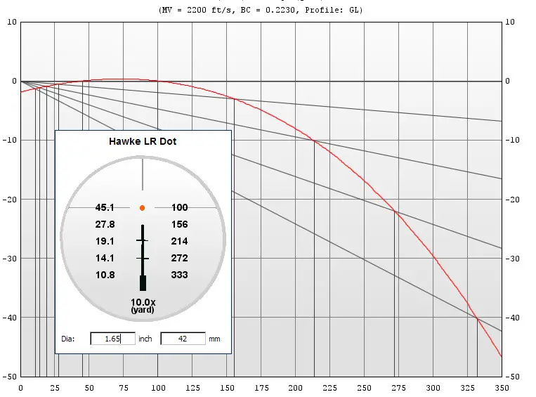 the full range of the Hawke reticle, with this load takes you to 333 yards