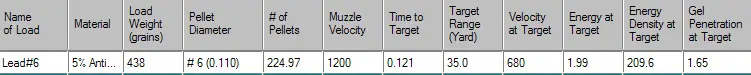 Although the lead load is heavier at 1-1/4 oz., and has a slightly faster muzzle velocity meaning higher recoil, at 55 yards the Time of Flight to Target is identical at 0.215 second. Yet, the lower recoil Heavyweight #7 has a significantly better pellet count and significantly deeper penetration at 55 yards. The better pellet count and penetration is of benefit at all hunting ranges. The Heavyweight #7 load has about 14% more pellets (that do not deform on setback), 26% deeper penetration at 55 yards, and noticeably less recoil. For a six pound gun, the lead load has about 33.63 ft. lbs. of recoil energy vs. about 24.92 ft. lbs. of recoil energy for the Heavyweight load: the lead load has about 35% more actual recoil.